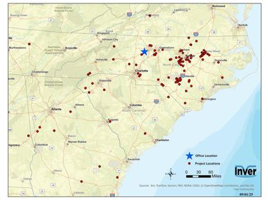 Inver is centrally located near Winston-Salem, North Carolina within a short drive of Asheville, Charlotte, Fayetteville, and Raleigh (see map above). Our experience includes natural and water resources field work in 94 of the 100 North Carolina counties, literally from Murphy to Manteo.